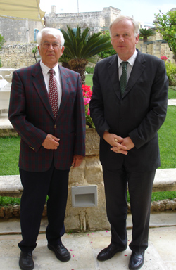 Der Vorsitzende des Arbeitskreises auf Burg Rothenfels Herbert Brehm mit dem Deutschen Botschafter in Malta Herr Karl Andreas Freiherr von Stenglin nach der Übergabe der Plakette des Arbeitskreises und eines Buches über den Landkreis Mainspessart im Garten der Residenz des Botschafters.