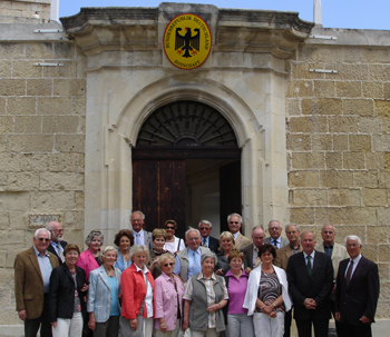 Die Reisegruppe des Arbeitskreises auf Burg Rothenfels vor der Deutschen Botschaft in Malta mit dem Deutschen Botschafter Karl Andreas Freiherr von Stenglin.