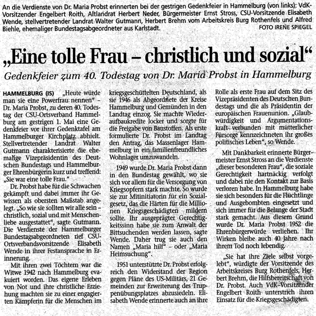 Herbert Brehm vom Arbeitskreis Burg Rothenfels erinnerte an das Engagement von Dr. Maria Probst im Lager Hammelburg und nannte sie ‚eine der großen Frauen der Nachkriegsgeschichte‚‘. Ausgehend von dem Leitgedanken "Gerechtigkeit schafft Frieden" sei eines ihrer Ziele gewesen, die Demokratie im Bewusstsein der Bevölkerung zu verankern, ihre Arbeit überparteilich und überkonfessionell. Sie habe die Ideale vorgelebt, die nun als Vermächtnis weitergetragen würden. VdK - Vorsitzender Engelbert Roith erinnerte daran, dass Dr. Maria Probst der VdK- Kreisverband ins Leben gerufen habe. Sie habe dafür gesorgt. dass Kriegsopfer ein Mindestmaß an Versorgung und Rente erhielten. Ohne ihr Engagement und ihre Hilfe hätten viele nicht mehr weiter gewusst. Das Zustandekommen des Bundesversorgungsgesetztes sei eines ihrer großen Verdienste. Markus Reh
