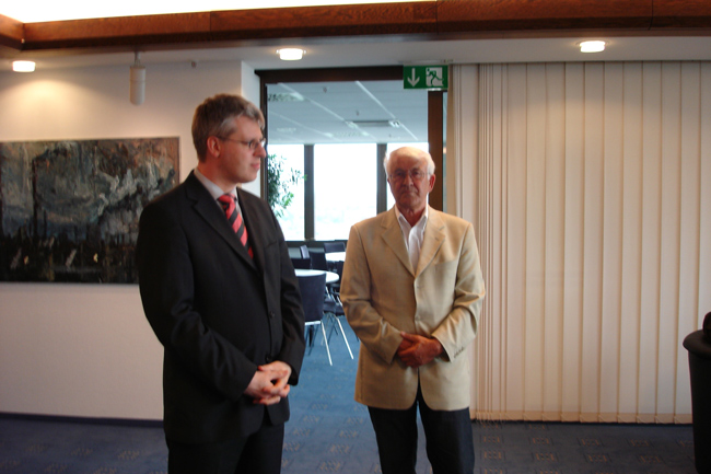 Der Vorsitzende des Arbeitskreises Herbert Brehm, mit dem Büroleiter des Oberbürgermeisters der Stadt Essen Herrn Kromberg im 22.Stockwerk des Rathauses